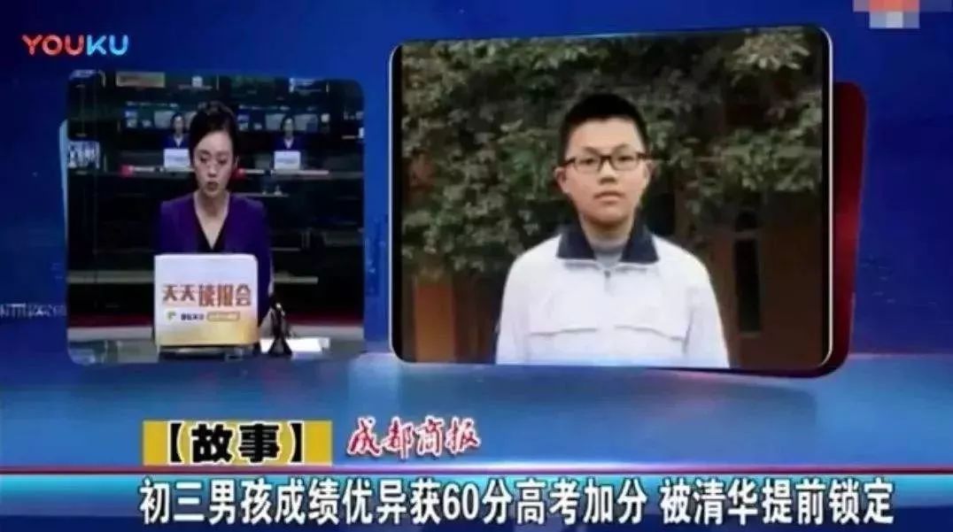 一名15岁的初三学生温铠瑞,被清华大学提早确认,获得了高考加分60分。