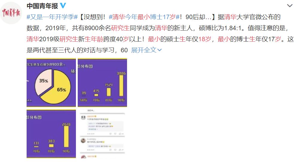 多个方面数据显现,本年清华选取的研讨生中,年岁最小的是一位博士生,仅17岁 。