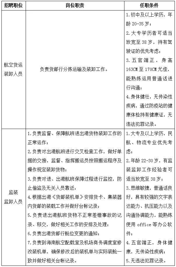 因作业需求,海南天边人力资源管理服务有限公司(以下简称“天边人力”)招聘若干名作业人员,差遣至海南美兰国际机场货运有限责任公司作业,招聘详细事项如下: