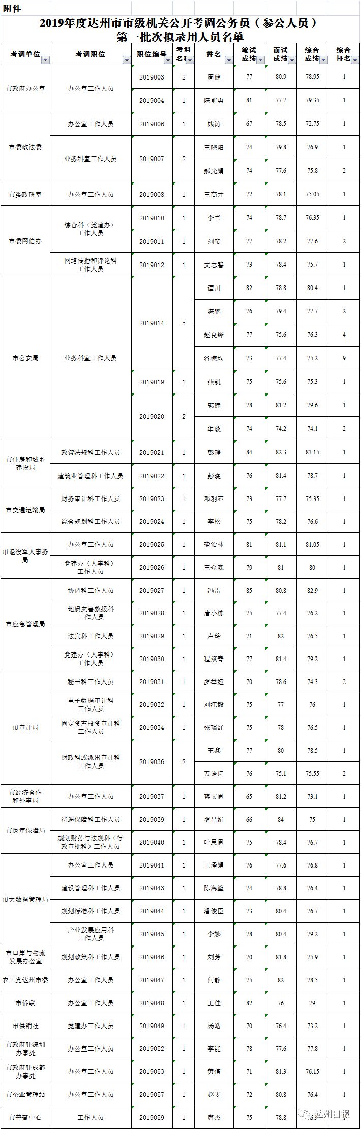 依照《2019年度达州市市级机关揭露考调公务员(参公人员)布告》规则,经书面考试、面试、调查、体检、试用环节,现依据各考调单位研究决定,将榜首批次拟选用人员公示如下。