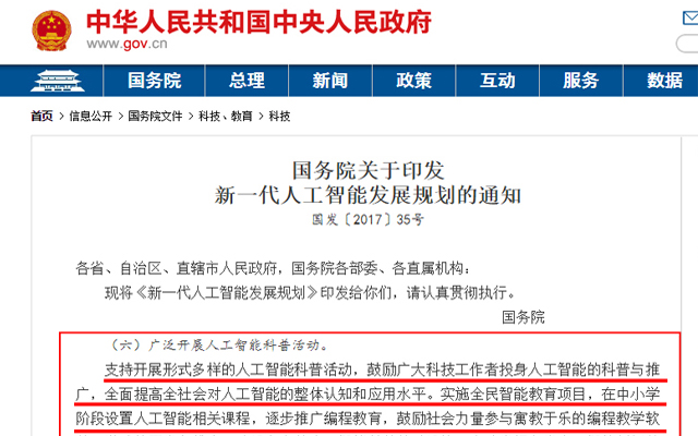 国务院印发《新一代人工智能发展规划》 :推广编程教育