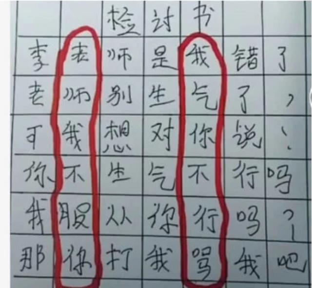 这个小学生写的反省书,看起来像一首小诗。从字面上看,小学生是乎知道到了自己的差错,言外之意都充满了悔意。可教师不是那么好骗的,一会儿就抓住了孩子的小心思,用红笔圈了出来。本来这篇反省书暗藏玄机。第2行顺着念:教师我不服你。这哪里是知道到了过错?清楚是对教师的批判有定见,看来还得对他进行再教育。