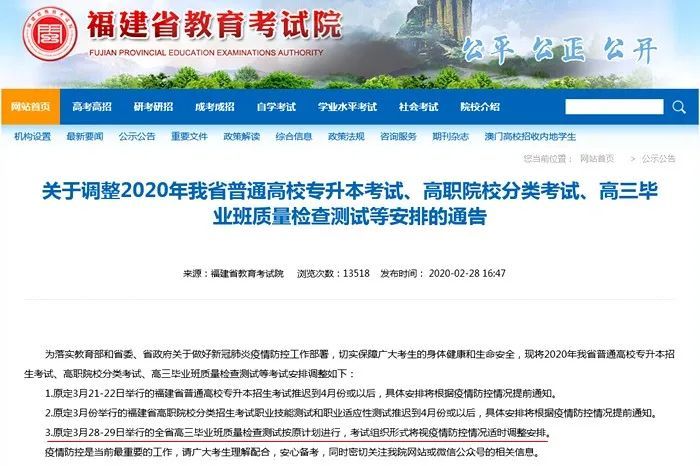 不知我们注意到没有,2月28日,福建省教育考试院发布的一份布告,推延了多个3月份考试,但原定3月28-29日举办的全省高三结业班质量检查测验按原计划进行,考试组织形式将视疫情防控状况当令调整组织。