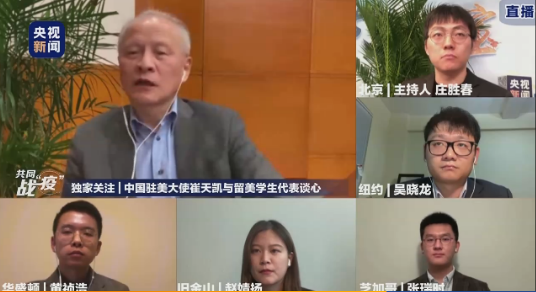 美国新冠肺炎疫情不断延伸,多方重视留学生安全。今日(19日),驻美大使崔天凯做客央视新闻直播间,在线与留美学生代表谈心。