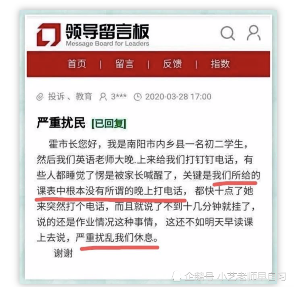 最近学生们、家长们以及教师们都在纷纷议论一个有关于写作业的事,明显这是受到了前阵子发作的教师被投诉的事影响。作业的原因是教师深夜十点钉钉给学生催作业,而导致该教师被学生投诉到教育局领导处,然后受到了领导的批判,以为是延迟教育时刻,增加了学生的担负。